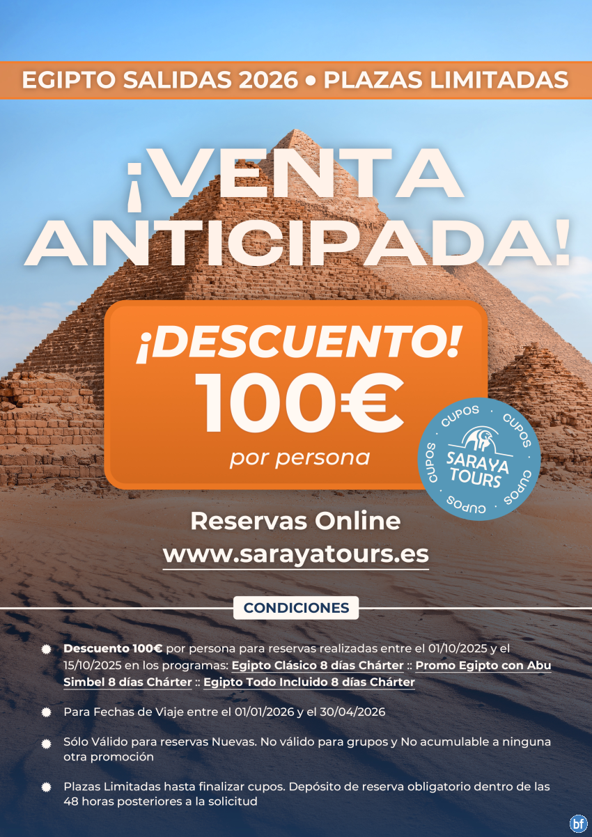 ¡¡ EGIPTO Venta Anticipada !! Descuento 100 € p.persona. Salidas 01/01/26 al 30/04/26. Plazas limitadas.