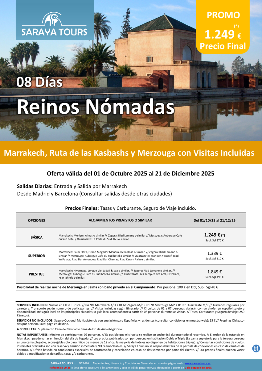 Reinos Nómadas 8d : Rak, Zagora, Merzouga, Ouarzazate con visitas incl. hasta Dic26.